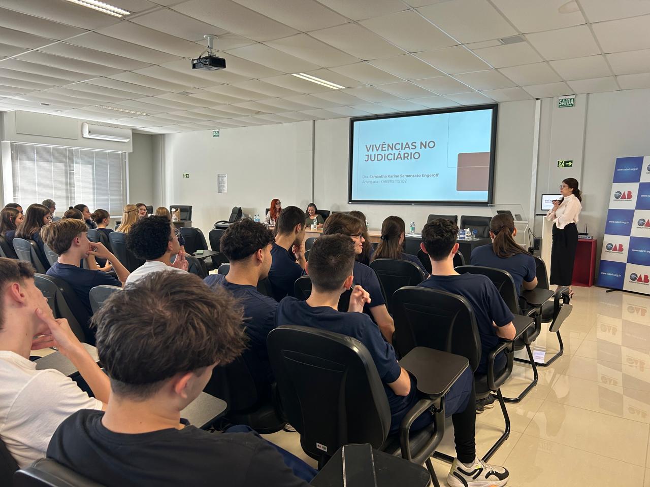 A atividade, organizada pela professora Mariângela Rosa, integra o projeto “OAB Vai à Escola”, que busca aproximar os jovens do ambiente jurídico e promover reflexões sobre cidadania, democracia e justiça social. Durante a tarde, os alunos participaram de uma programação diversificada, com palestras ministradas por advogados e membros de diferentes comissões da OAB.